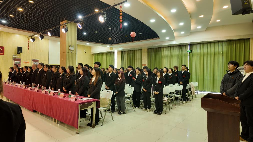 伴随着雄壮激昂的《中华人民共和国国歌》,大会正式拉开帷幕。全场代表肃立齐唱,嘹亮的歌声里,是商院学子对祖国的赤诚,更是对青春使命的坚定担当。