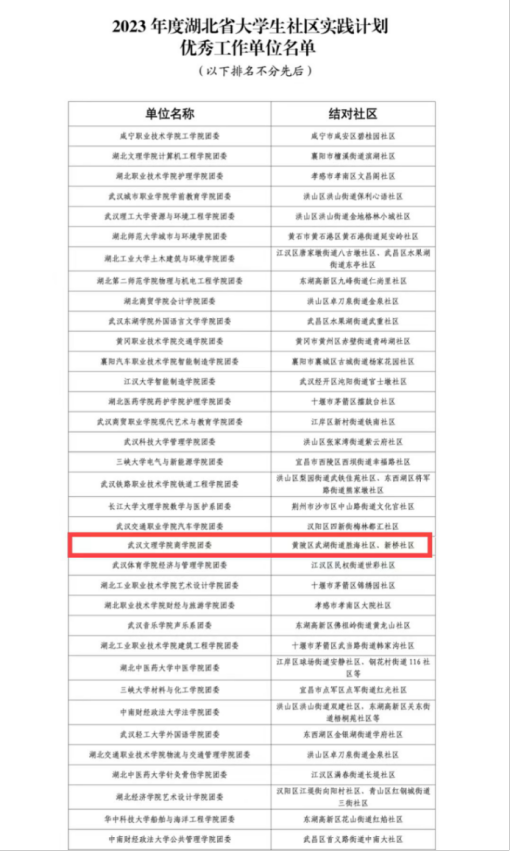 2023年11月10日,在湖北省大学生社区实践计划优秀工作单位评选中,我院团委荣获“优秀工作单位”荣誉称号。这是一份荣誉,更是一种激励,这份荣誉学院领导的支持和学生会每位成员的辛苦付出。