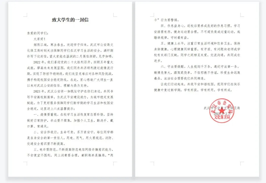 烟雨江城,寒去春生,欢迎学子归来。武汉市公安局文化保卫局时刻关注保障同学们在汉学习生活的安全,满怀期许写下这封信,望大家能在温润的二月展信颜舒,见字如晤。