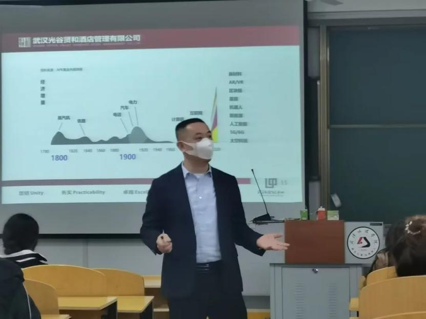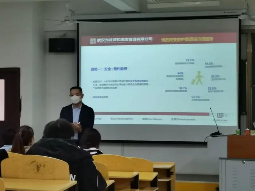 周庆黎先生从投资者的角度向学生具体介绍了现代酒店发展前景并分享了他与武汉会议中心共发展的工作经验。周庆黎先生用生动的故事和翔实的数据指出:近几年本土品牌酒店发展该如何走出困境,终究要讲一个“变”字。他强调在疫情情况下,酒店行业更要出新方法,新变革,才能长久存活下去。