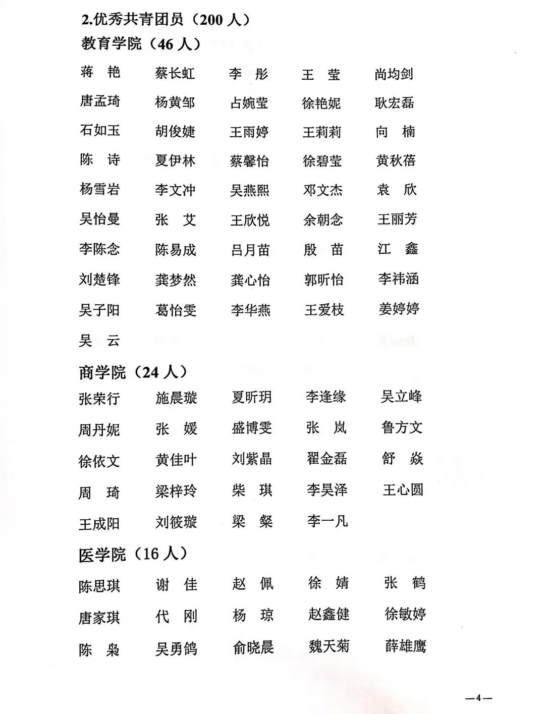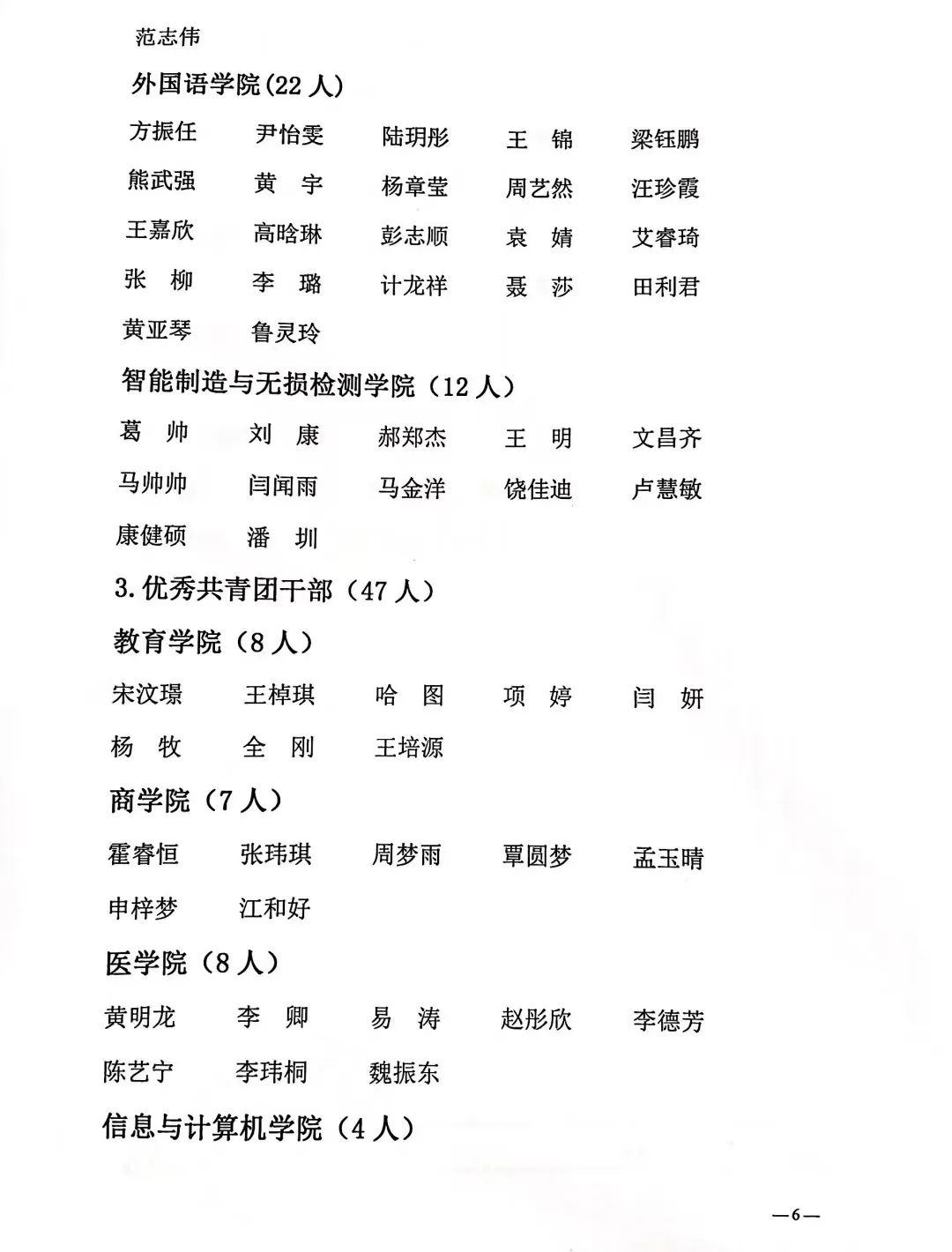 授予张凤等5位同志“优秀共青团工作者”荣誉称号;授予蒋艳等200名同学“优秀共青团员”荣誉称号;授予宋汶璟等47名同学“优秀共青团干部”荣誉称号。