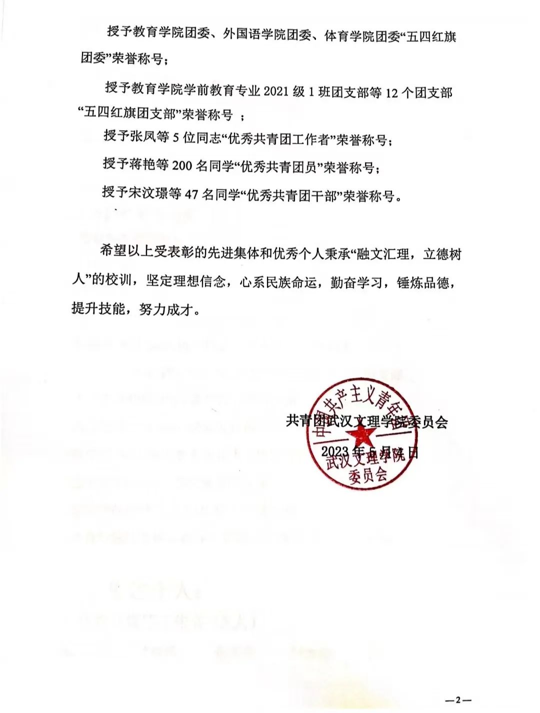 授予教育学院学前教育专业2021级1班团支部等12个团支部“五四红旗团支部”荣誉称号;