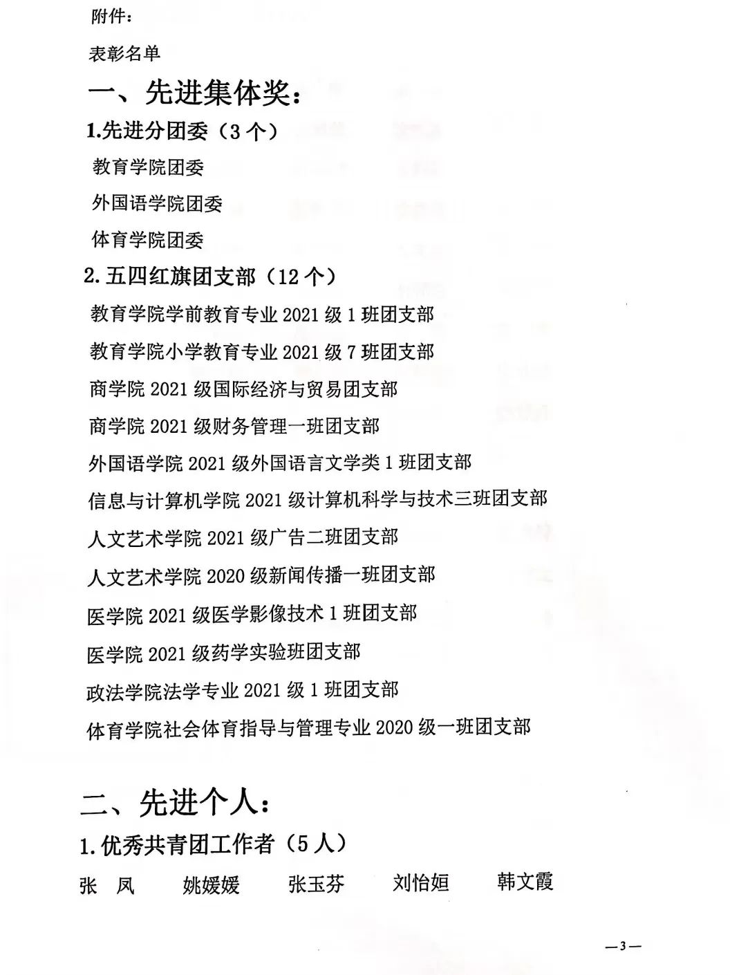授予教育学院团委、外国语学院团委、体育学院团委“五四红旗团委”荣誉称号;