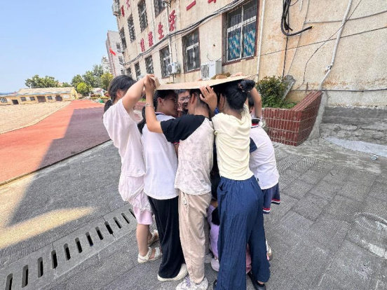在“纸上站兵”活动中,每个队伍在拿到纸板后都积极思考,其中有一个队伍将纸板举在头顶上,高个子的同学将小个子的同学围在中间,保证每一位队员都能待在纸板形成的空间里面;还有一个队伍的同学把队员分成了两小队,将纸板隔在中间,两小队的同学分别蹲在纸板的两边,想象用一个倒着的长方体空间“框”住每一位队员。