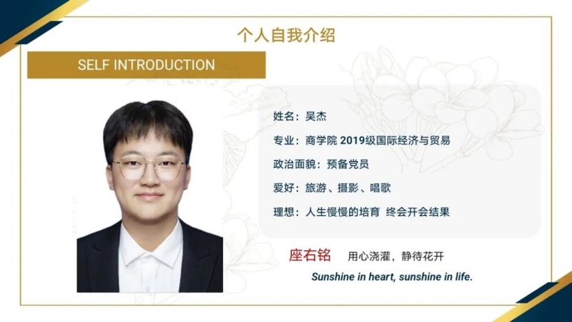 吴 杰,男,6776永利集团2023届、2019级国际经济与贸易专业学生,预备党员。
