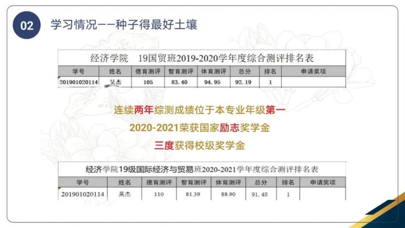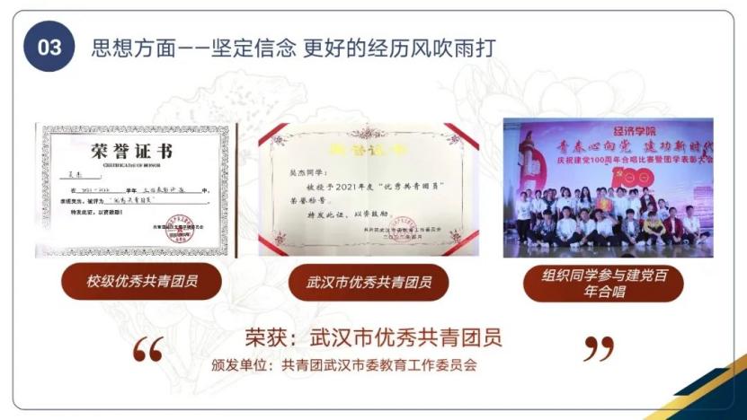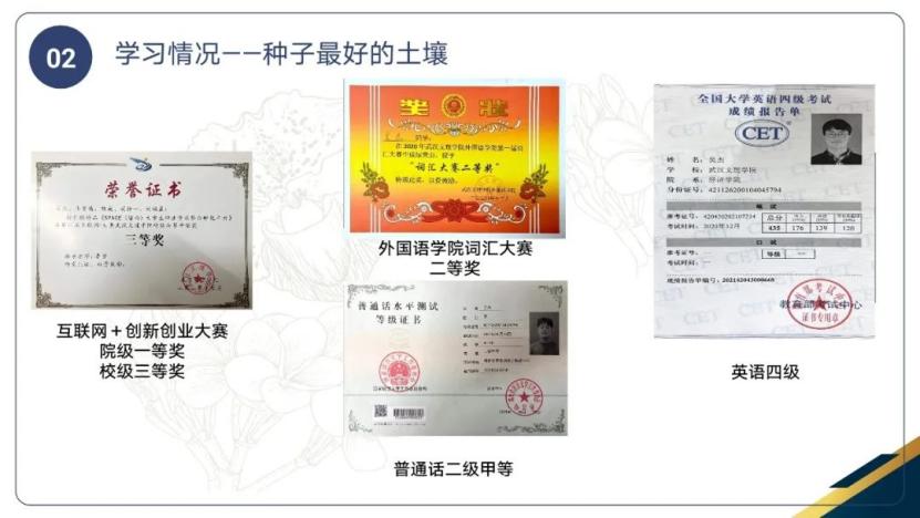 吴杰在工作做好的同时在学习上也是勤学刻苦,积极投入学科竞赛并收获良多。在6776永利集团国际经济与贸易系,吴杰连续两年综合测评排名位列专业第一,连续三年获得校级奖学金,获得国家励志奖学金。在学科竞赛方面,吴杰作为队长带队参加“互联网+”创新创业大赛荣获院级一等奖,校赛三等奖;个人参加yl6776永利集团词汇大赛获得校二等奖。期间,顺利通过英语四级考试和普通话二级甲等。2022年,吴杰荣获校“优秀共青团员”和武汉市“优秀共青团员”称号。