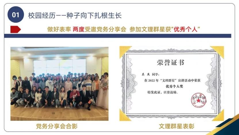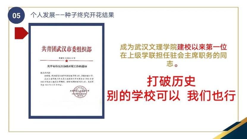 2022年6月,吴杰作为文理学院学生干部被学生处推荐至共青团武汉市委员会,面试武汉市学联驻会主席职务。他通过多轮笔试面试,用实际成绩战胜江汉大学的研究生以及其他高校学生等竞争对手,当选武汉市学生联合会驻会执行主席,成为yl6776永利集团第一名在上级学联担任驻会主席的学生干部,为学校赢得荣誉。
