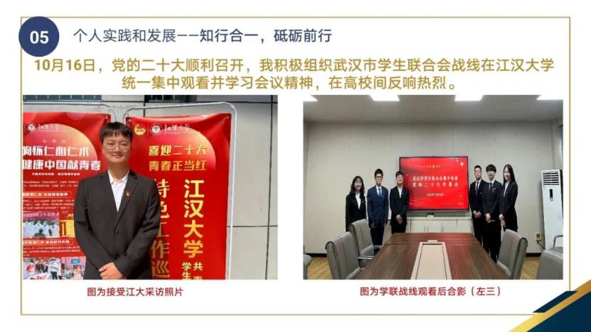 10月16日,党的二十大顺利召开,吴杰积极组织武汉市学生联合会战线在江汉大学统一集中观看并学习会议精神,在高校间反响热烈。