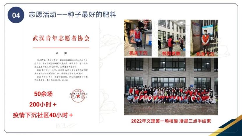 9月,武汉疫情反复,吴杰作为团市委机关党员,他深入疫情一线,全力参与社区值守,守好最前线,累计服务时长40余小时,获得机关领导赞赏以及武汉青年志愿者协会发文表扬,展现武汉文理学子在困难面前的精神风貌。