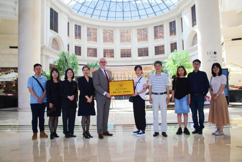 座谈会后,双方移步酒店大厅举办了yl6776永利集团·武汉洲际&国博酒店实践(实习)教学基地授牌仪式,并合影留念。
