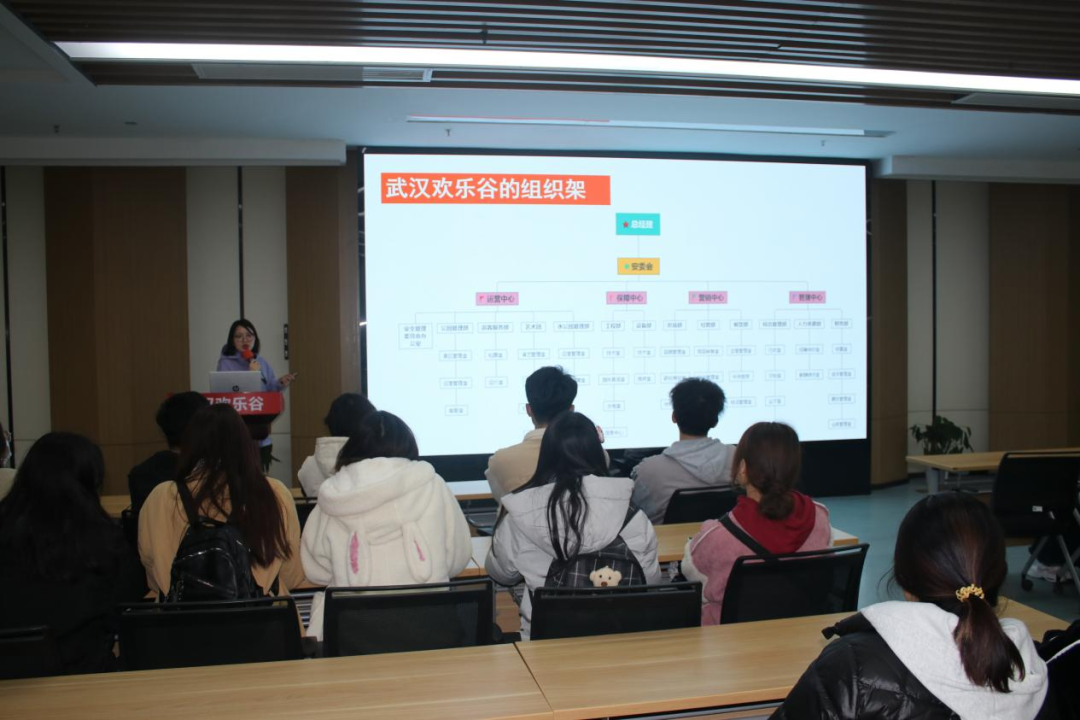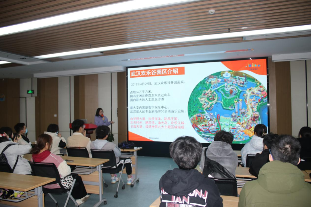 郭泽华老师强调:欢乐谷是武汉众多高校的就业基地,为青年人的成长和发展提供了众多空间和机遇。随着郭则华老师的深入的介绍,学生们更加了解了武汉欢乐谷的岗位需求和人才培养计划。