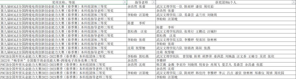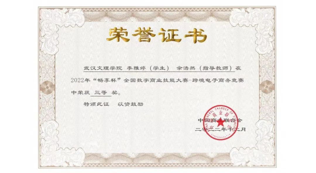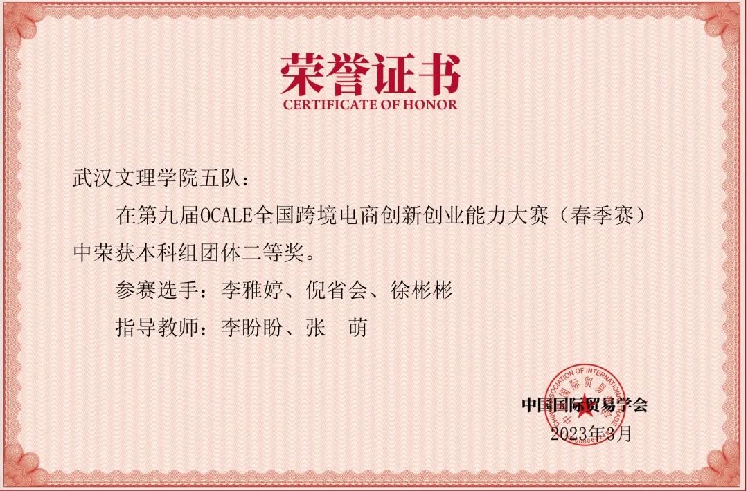 2022-2023年,6776永利集团张蕾院长,6776永利集团国际经济与贸易系主任余浩然、教师陈蕾、李盼盼、汪笛晚、李昕、沈萌、郭松燕、汪泉、祝黎敏 等老师指导国际经济与贸易专业学生在中国国际贸易学会举办的第十一届、第十二届POCIB全国大学生外贸从业能力大赛以及第九届OCALE全国跨境电商创新创业能力大赛中荣获国家和个人众多奖项。其中,2个师生团队在第十二届POCIB全国大学生外贸从业能力大赛荣获全国三等奖,2个师生团队和4个师生团队在第九届OCALE全国跨境电商创新创业能力大赛中分获全国二等奖、三等奖。