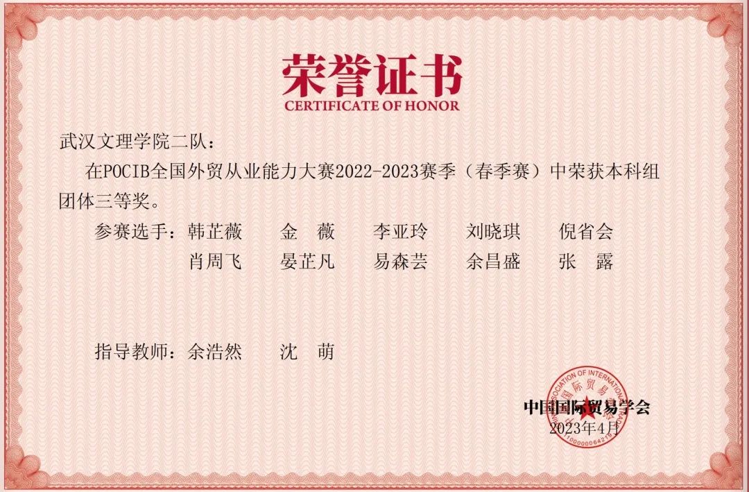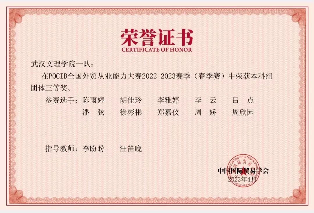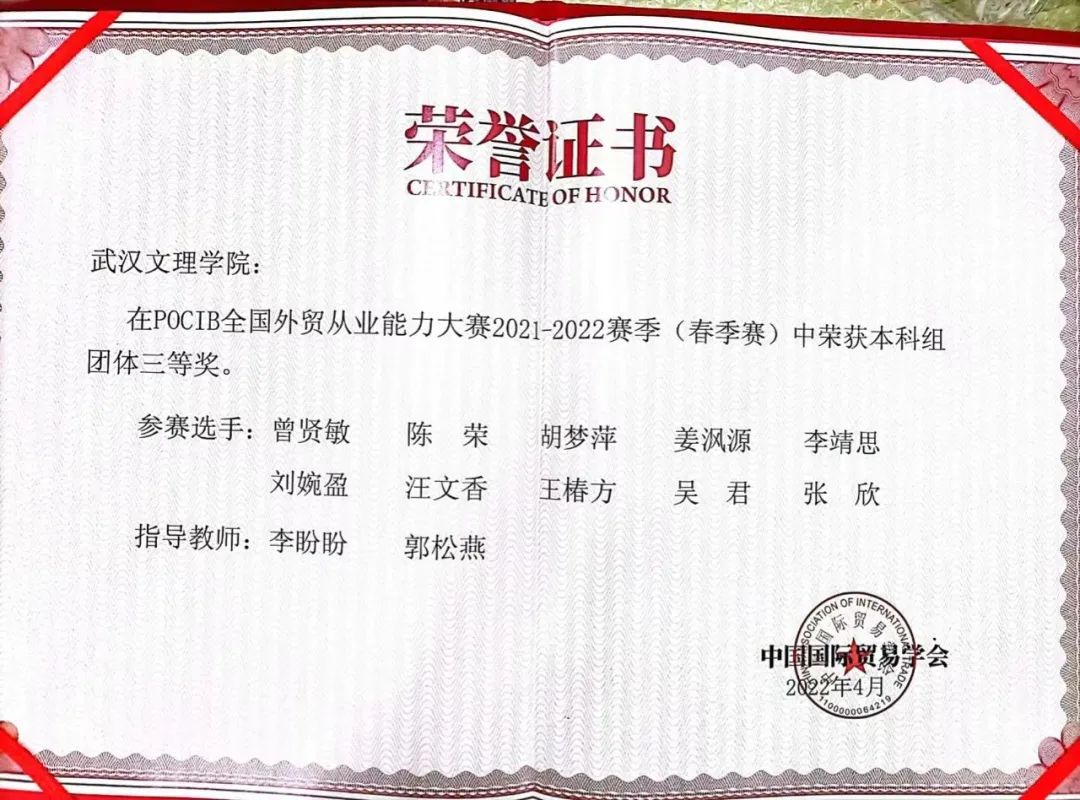 2022年中国国际贸易学会主办的“第十一届POCIB全国外贸从业能力大赛(春季赛),详情请点击:【学科竞技】6776永利集团2019级国贸学生荣获第十一届POCIB全国大学生外贸从业能力大赛团体三等奖